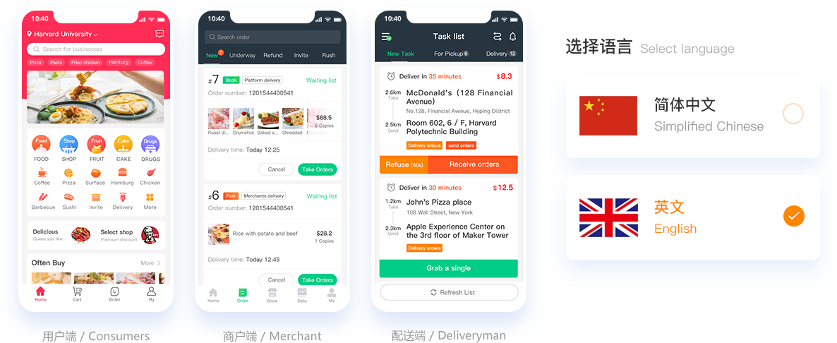 云虎同城O2O系統(tǒng)用戶端、商家移動(dòng)端、配送端支持中英文語言一鍵切換,同時(shí)支持其他國家語言定制開發(fā)需求