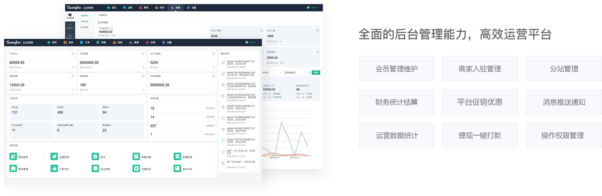 平臺(tái)代理分站擁有獨(dú)立管理后臺(tái),獨(dú)立管理分站商家、商品、訂單等,運(yùn)營(yíng)商后臺(tái)掌握系統(tǒng)所有終端數(shù)據(jù)、統(tǒng)一管理